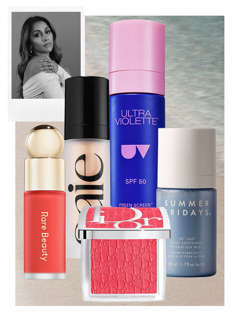 Blush is a must in my summer kit – especially a rich, red-toned one that mimics the look of a day in the sun. My favourites right now include Charlotte Tilbury’s Matte Beauty Blush in ‘Dream Pop’, Rare Beauty’s Soft Pinch Liquid Blush in ‘Grateful’, and Dior Backstage Rosy Glow in ‘Cherry’. To stay cool and refreshed, I keep a hydrating mist on hand and spritz every couple of hours. The Charlotte Tilbury Magic Hydrator Mist and Summer Fridays Jet Lag Mist are both great for giving the skin a quick boost.
