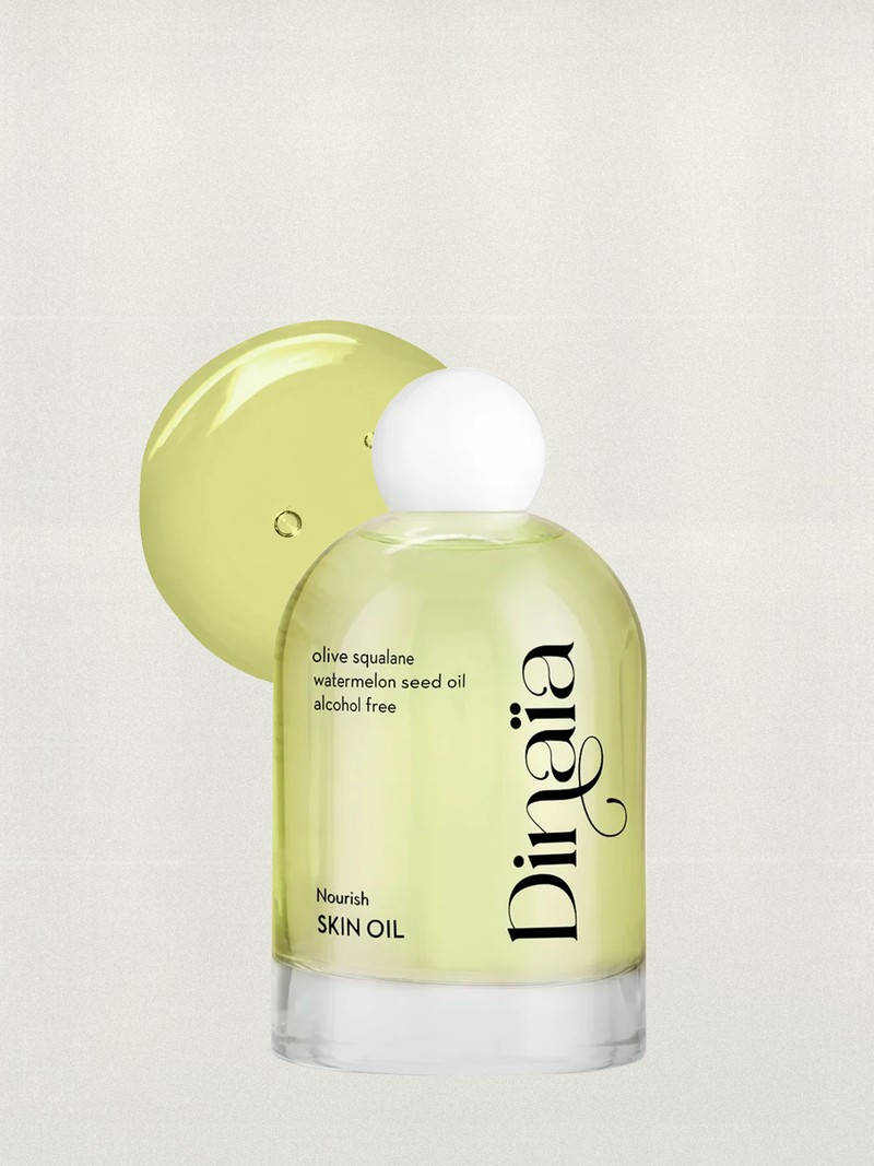 Dinaia's Nourish Skin Oil offers deep hydration with olive squalane and watermelon seed oil. This 99% naturally derived, alcohol-free formula absorbs easily, enhancing skin suppleness and moisture. Infused with antioxidants and a luxurious scent of frankincense, patchouli, and myrrh, it leaves your skin looking radiant and feeling smooth. Perfect for the face and body, it’s ideal for dry skin.