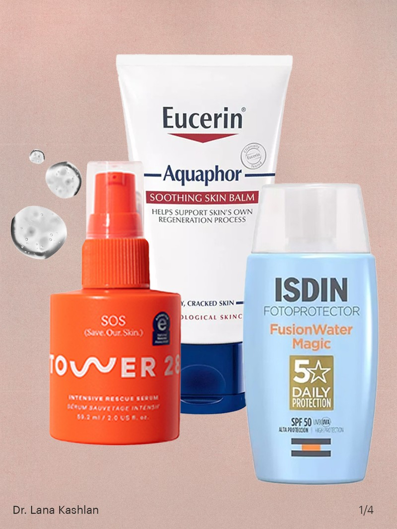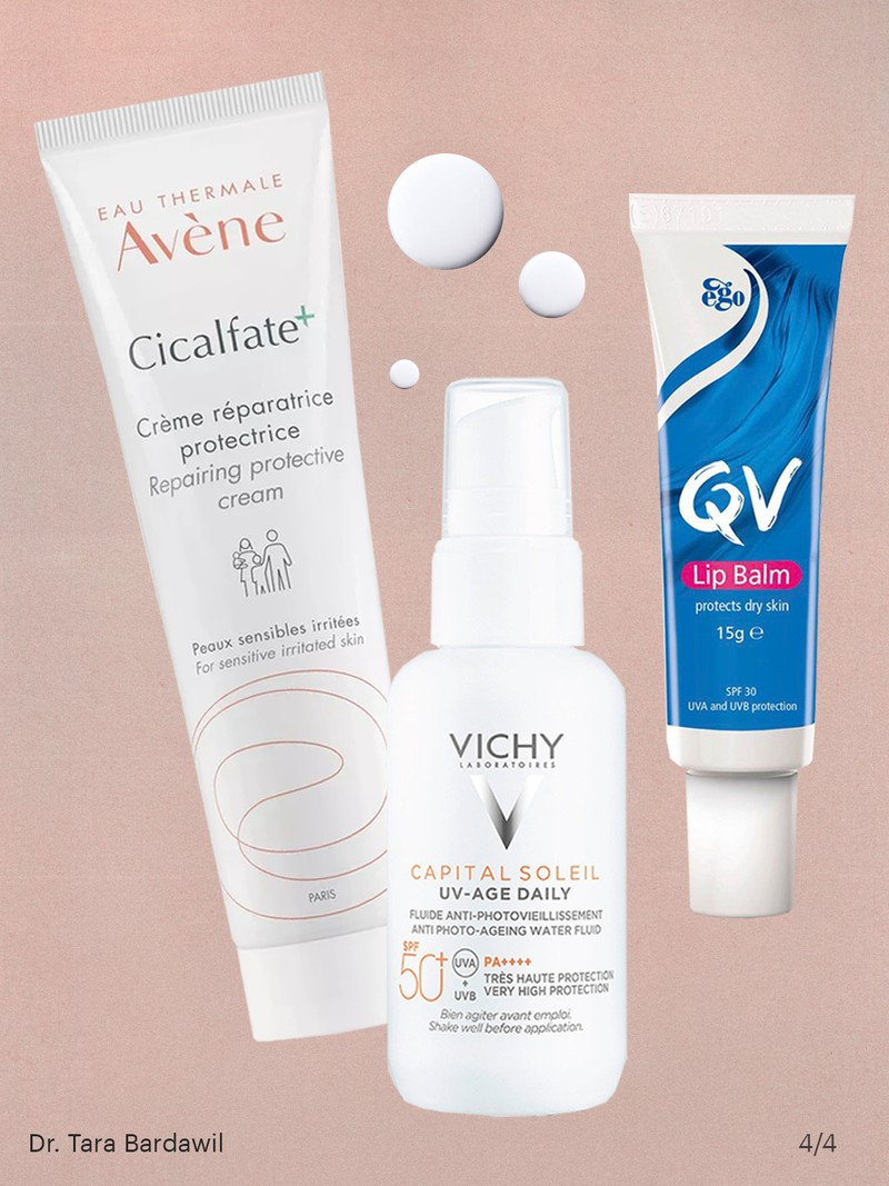 “My number one tip for in-flight skincare is to wear sunscreen. The UV exposure on the plane is much greater than on land and so if you’re sitting next to the window make sure to apply sunscreen and close the window shade. I make sure to remove my make-up before overnight flights and then apply my retinoid cream to prevent any acne breakouts. I follow this with a barrier-repairing moisturiser like Avene Tolerance Control Soothing Skin Recovery Cream, and then apply Isdin Fotoprotector Fusion Water Magic SPF 50 Facial Sunscreen. I always travel with a small tube of the Eucerin Aquaphor Soothing Skin Balm because I can use it as an eye cream and to keep my lips hydrated. Finally, I always travel with the antibacterial hypochlorous acid from Tower 28 to cleanse my hands and face mid-flight.”