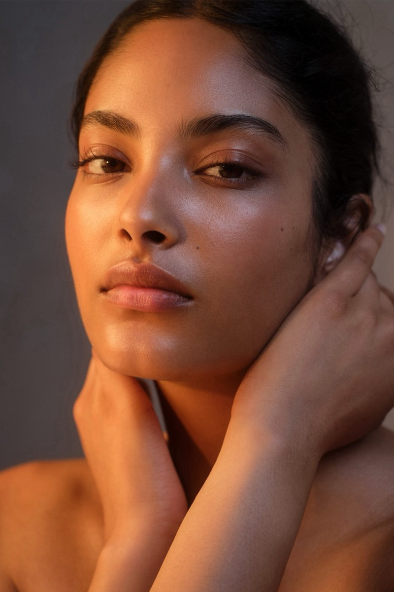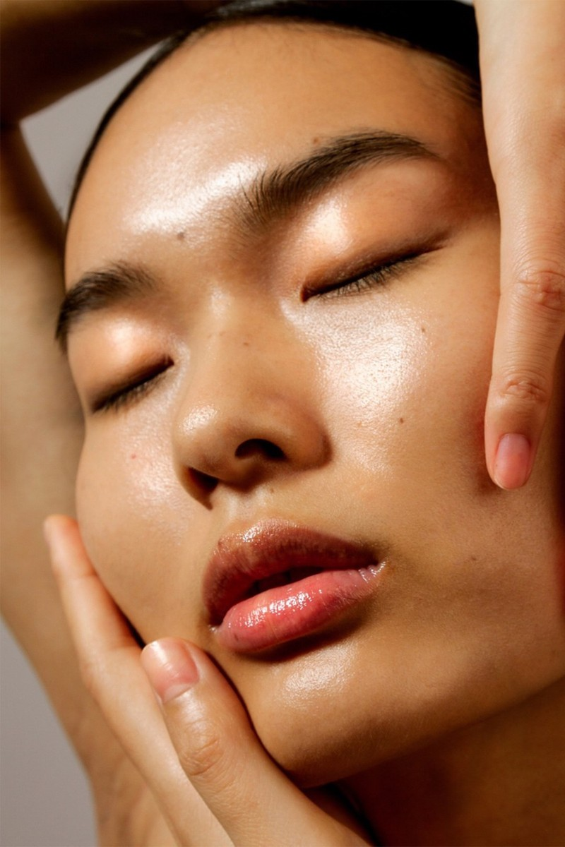 If you are looking for a dewy, natural glow, use a lip balm to get that juicy finish – especially on your cheekbones. Once you’ve applied your base, blush and cream bronzers (you are going to want to keep your base super light) you can take a little bit of lip balm – preferably a liquid or another very soft consistency – and place it in the centre of your palms. Press your palms firmly and directly onto the tops of your cheekbones and out towards the hairline to get that glossy glow.