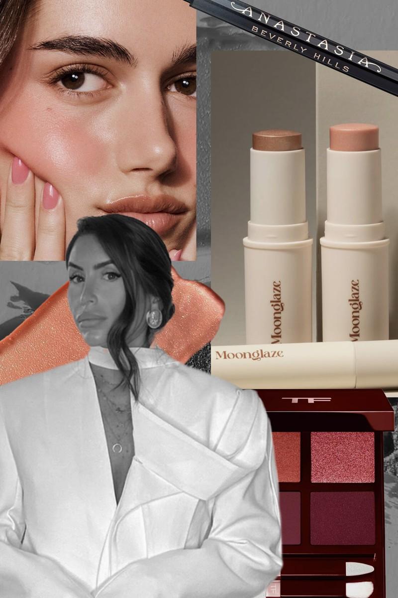 Starting with cheeks, I recently discovered the SimiHaze Beauty Colour Glaze Lip & Cheek Tint in ‘Lily’ – a warm, versatile shade that melts seamlessly into skin and doubles beautifully on the lips for a soft flush of colour. For lips, I swear by the Makeup By Mario Lip Liner in ‘Hugh’, the perfect browny nude. And because I can’t resist a bit of sparkle, the new Too Faced Kissing Jelly Quicky Queen Eyeshadow Sticks are my evening go-to – especially when dabbed on the inner corners for a pop of glitter. To finish, the Kosas Setting Spray is an everyday essential.