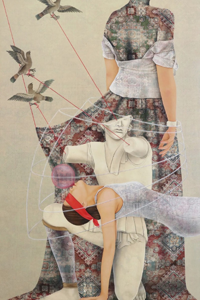 Born in Shahr-e Kord, Iran, Arghavan Khosravi now lives and works in Stamford, Connecticut. In her work, Arghavan explores the aesthetics of ancient Persian miniature paintings, which were originally used to illustrate folklore texts. Typically, the only women they portray have a subservient role, and through her work, Khosravi takes a look at how the value system transmitted by these depictions continues to shape Iranian gender politics today. Female bodies are often shown as being shackled or with their mouths sewn shut. One of the most striking characteristics of Khosravi’s paintings is their multi-dimensionality – constructed from layers of cut and painted wooden panels, they offer a constantly shifting perceptual experience.