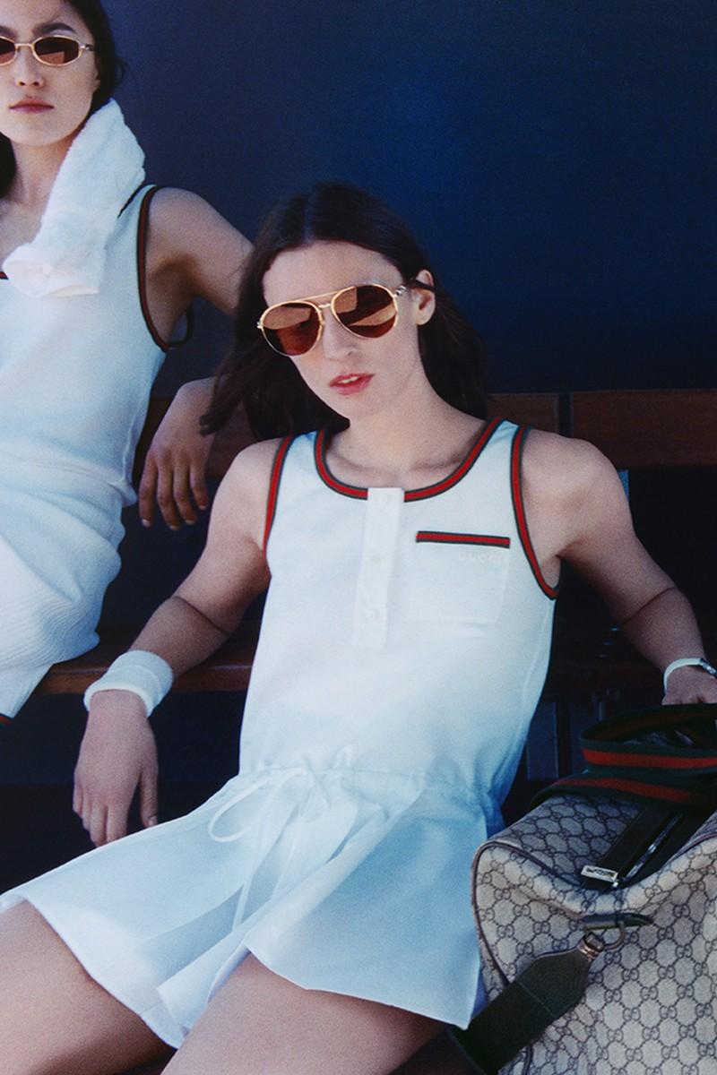 Gucci serves up a fresh take on summer style with its latest Tennis Eyewear campaign. Shot courtside in a sunlit club, the collection reimagines classic pilot and almond-shaped frames with a modern, cinematic twist. Think double-bridge silhouettes, crystal-embellished logos and sleek metal temples finished with Horsebit details and the signature Web stripe. The pieces are light, refined and undeniably Gucci.