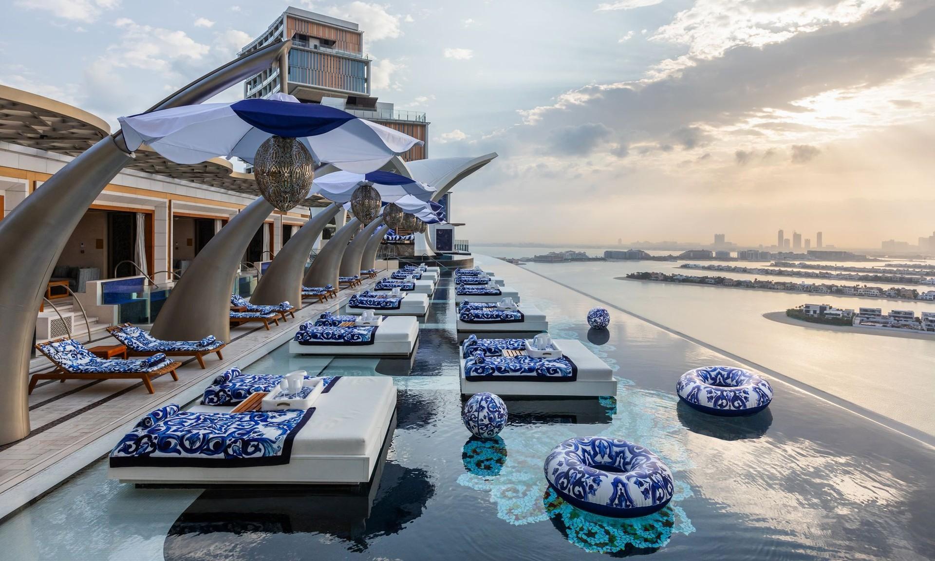 Visitors to Cloud 22, the infinity pool that sits 96 metres above the ground at Atlantis The Royal, will see Dolce & Gabbana’s iconic Majolica print everywhere they turn. The Italian brand has taken over the space with a little help from luxury e-commerce website Ounass for the next six months, lending its distinctive blue prnt to everything from loungers, inflatables and beach towels to plant pots and surfboards. As well as the aquatic takeover, Ounass has opened a pop-up store inside the hotel, stocked with D&G pieces from the Blue Majolica, Psychedelic Cart and Crystal Mesh collections.