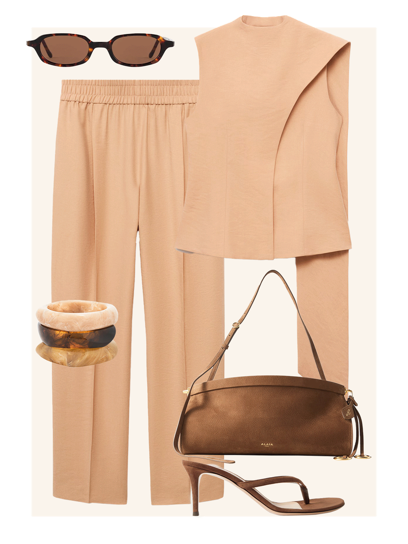 For a put-together look, style the foulard top with its matching trousers – polished with minimal effort. Keep the accessories refined and neutral to let the co-ord do the talking.