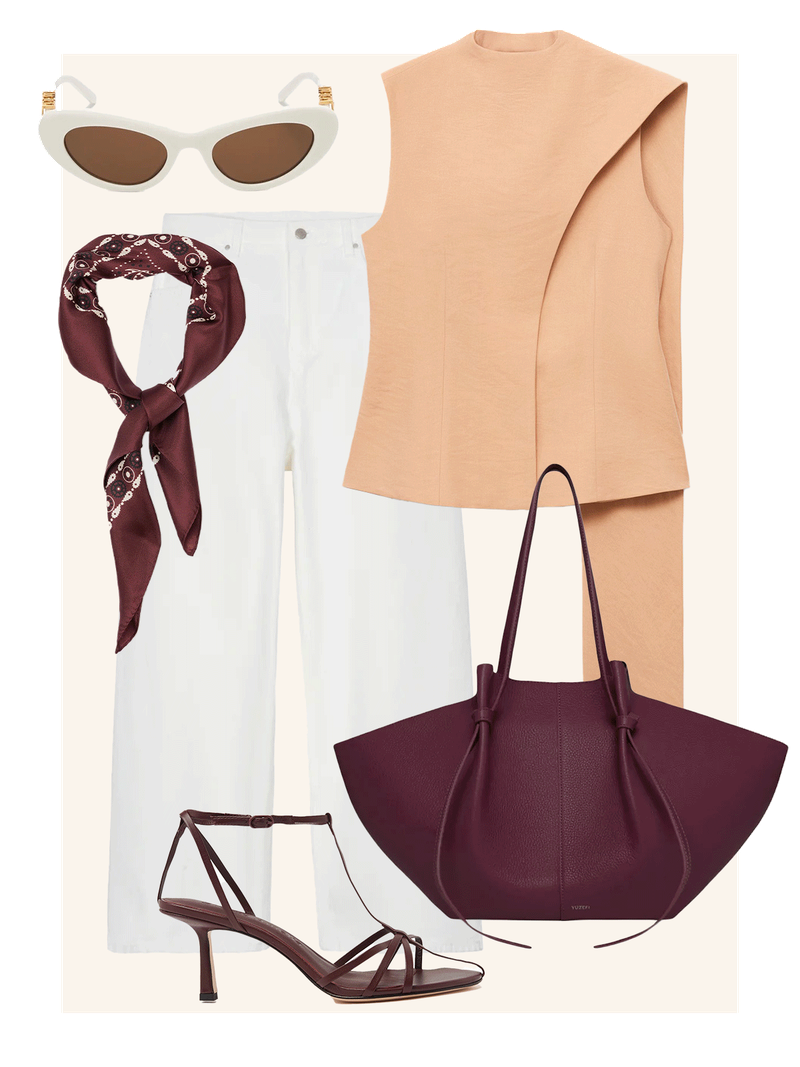 For an easy everyday look, the foulard top works perfectly with classic denim and a touch of burgundy for subtle colour contrast. It’s an effortlessly relaxed combo that still feels intentional and put-together.