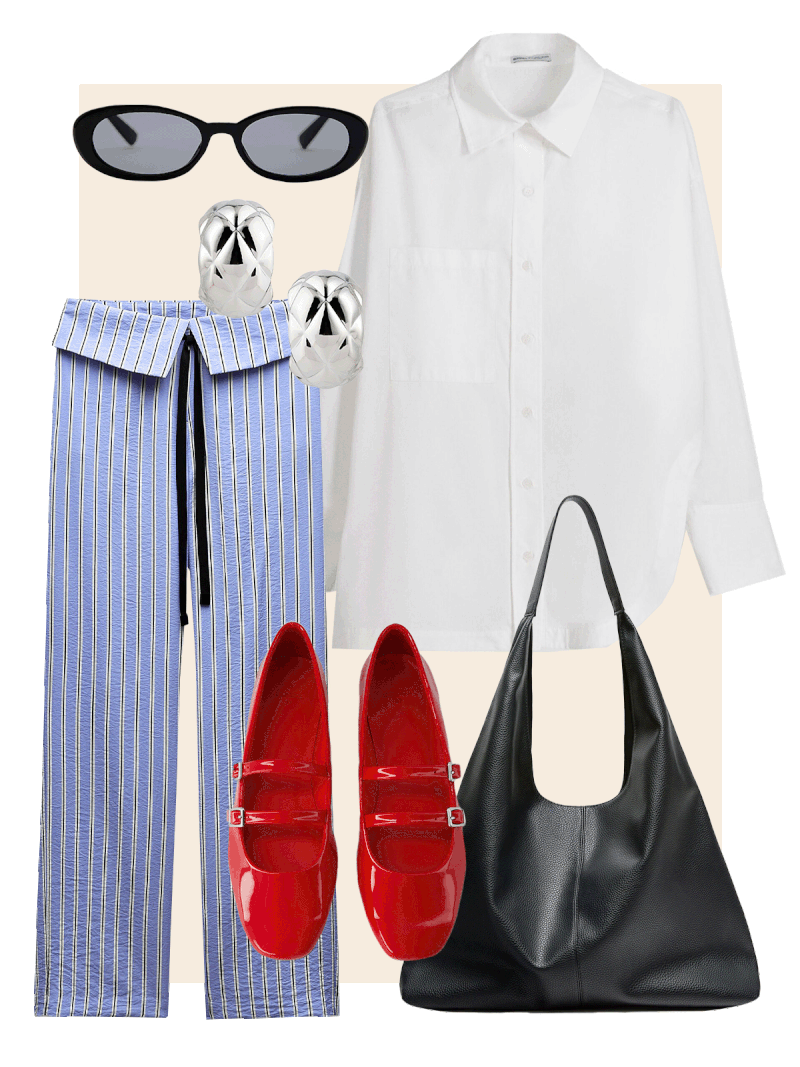 The pyjama trend is here to stay – style yours with a white shirt for a more modest approach, while a pop of red immediately lifts the look.