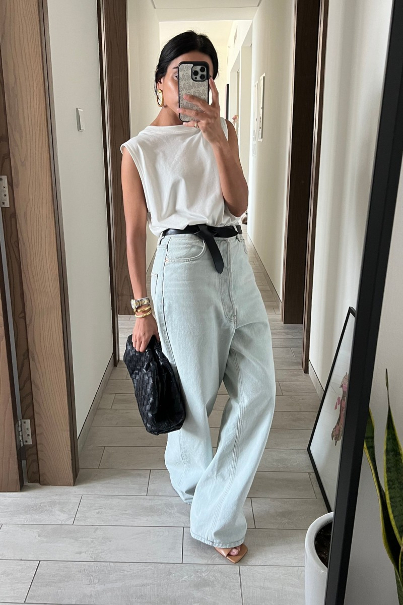 Rely on hero pieces. I think the three pieces everyone should have in their wardrobe are a good white t-shirt, a strong pair of jeans and an oversized blazer. The best white t-shirts I own come from COS and Loulou Studio, and I always have them dry cleaned – especially if they’re a really good fit. For jeans, I tend to rely on Raey’s really exaggerated styles. Some of the best oversized blazers I’ve found come from H&M – otherwise it’s worth checking out vintage stores. I did find an incredible Daniel Lee for Bottega Veneta black menswear blazer in a vintage store in Milan – it was brand new and now I share it with my husband.
