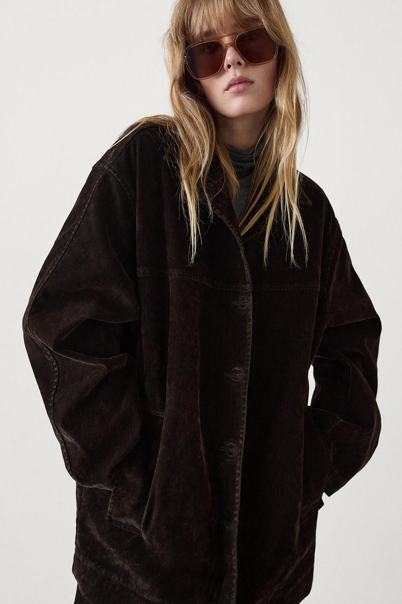 “This brown jacket would look great over athleisure wear – think brown leggings, long slouchy socks, a baseball hat and sneakers.”