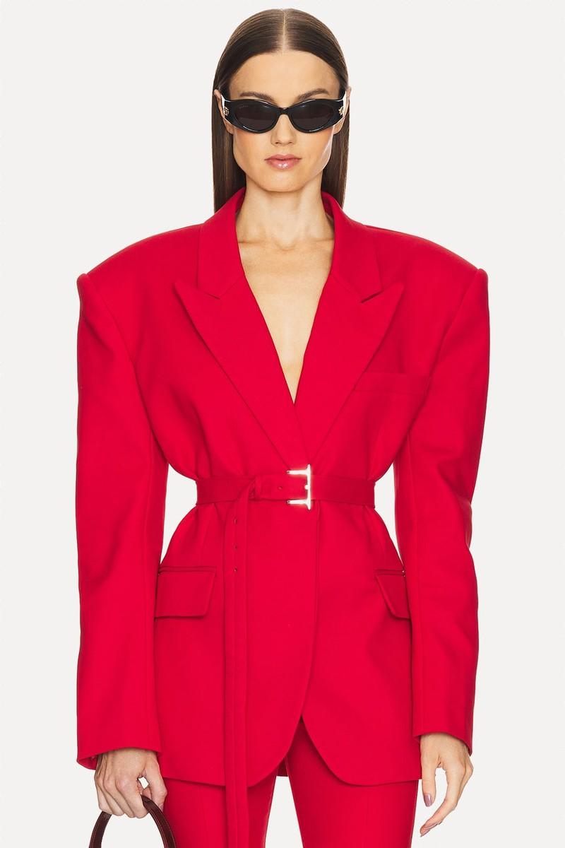 “I’m all over the red trend this season. This blazer has an interesting silhouette with its cinched belt detail. For a big event, I’d wear the full suit, but it can be styled separately too.”