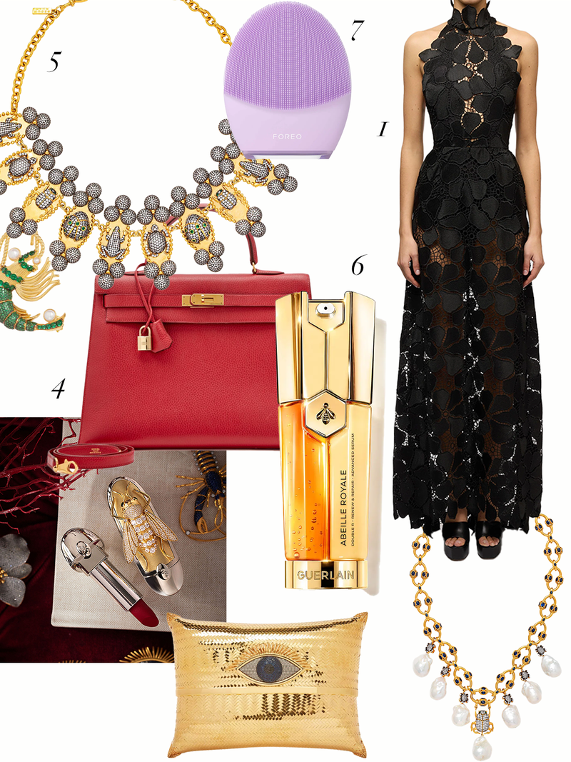 During the day, I like to use my vintage Hermès Kelly bag. I fill it with Misela pouches and organisers to make sure I can find everything I need. As you can see from our new collaboration with Guerlain, I always carry my Guerlain Rouge G lipstick with me. For the evening, I love our own golden clutches, especially the one with the Evil Eye on it.