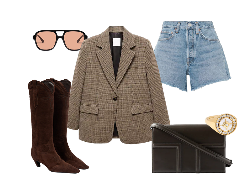 For an easy autumnal take, wear your boots with relaxed denim shorts and a houndstooth blazer. Match everything with tonal accessories to finish the look.