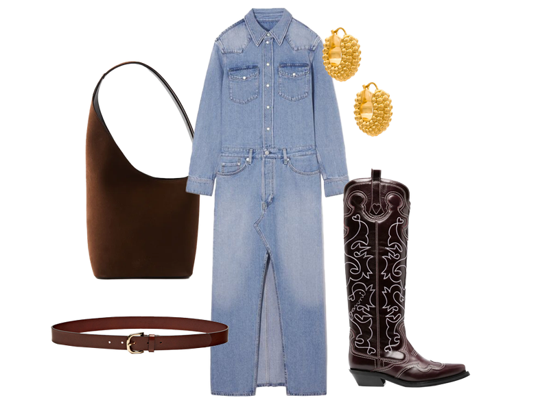 Cowboy boots and denim are the ultimate pairing – which is why this maxi dress from COS is a modern yet modest choice. Add brown suede accessories for a retro-chic vibe.