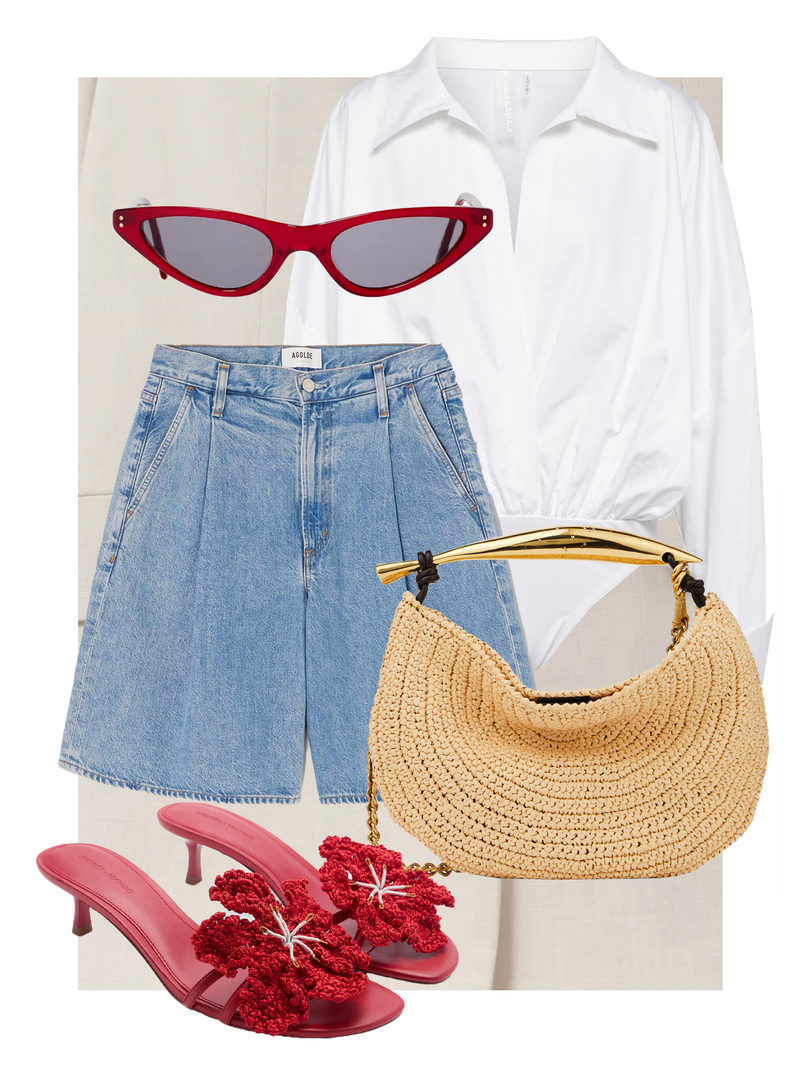 A pop of red goes a long way with a neutral look. Cat-eye sunglasses and statement mules are effortless finishing touches, too.