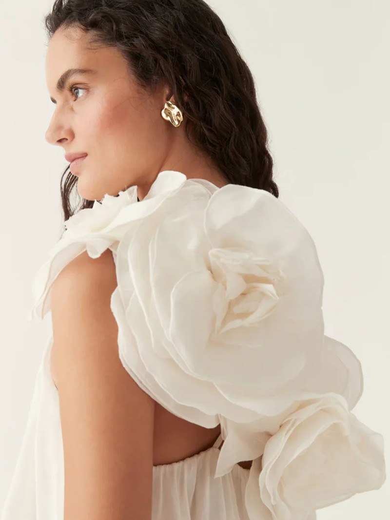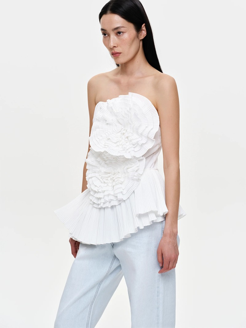 As seen on the runway, oversized sculptural flowers are big news. Balance the boldness of the added structure with a minimalist pair of wide-leg trousers.