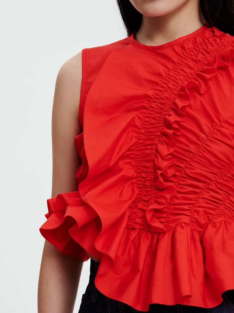 Pair this poppy top with a trending puffball midi skirt or high-waisted jeans to create a modern, romantic look.