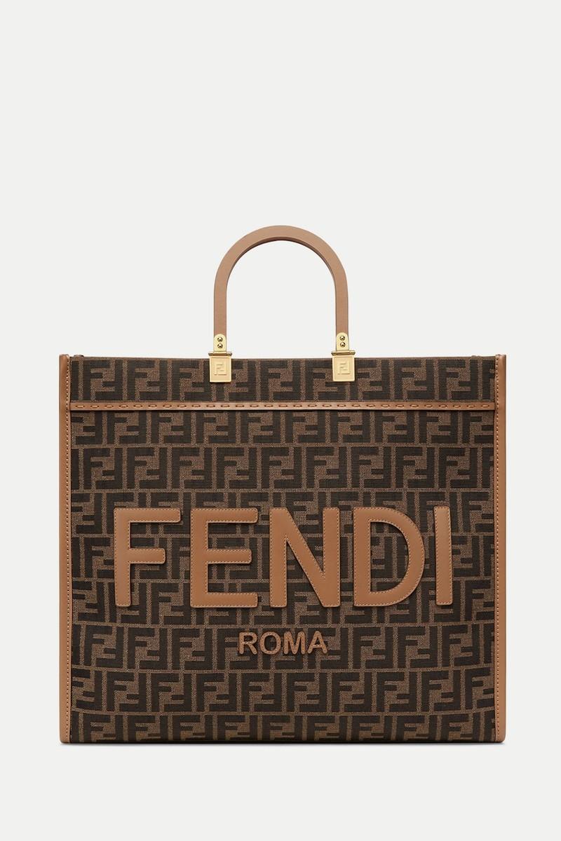 The Sunshine Shopper bag in FF jacquard fabric is the perfect all-weather carry-all. The light brown leather and gold-finish hardware give it an extra luxe feel.