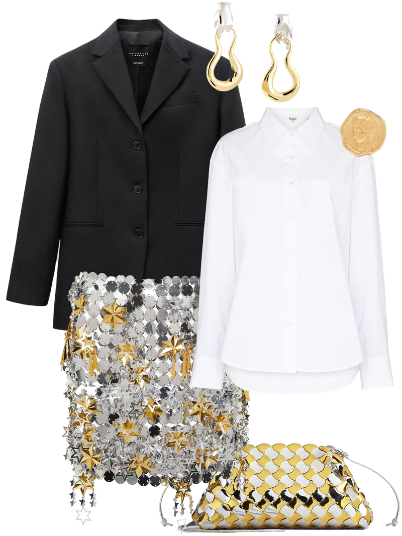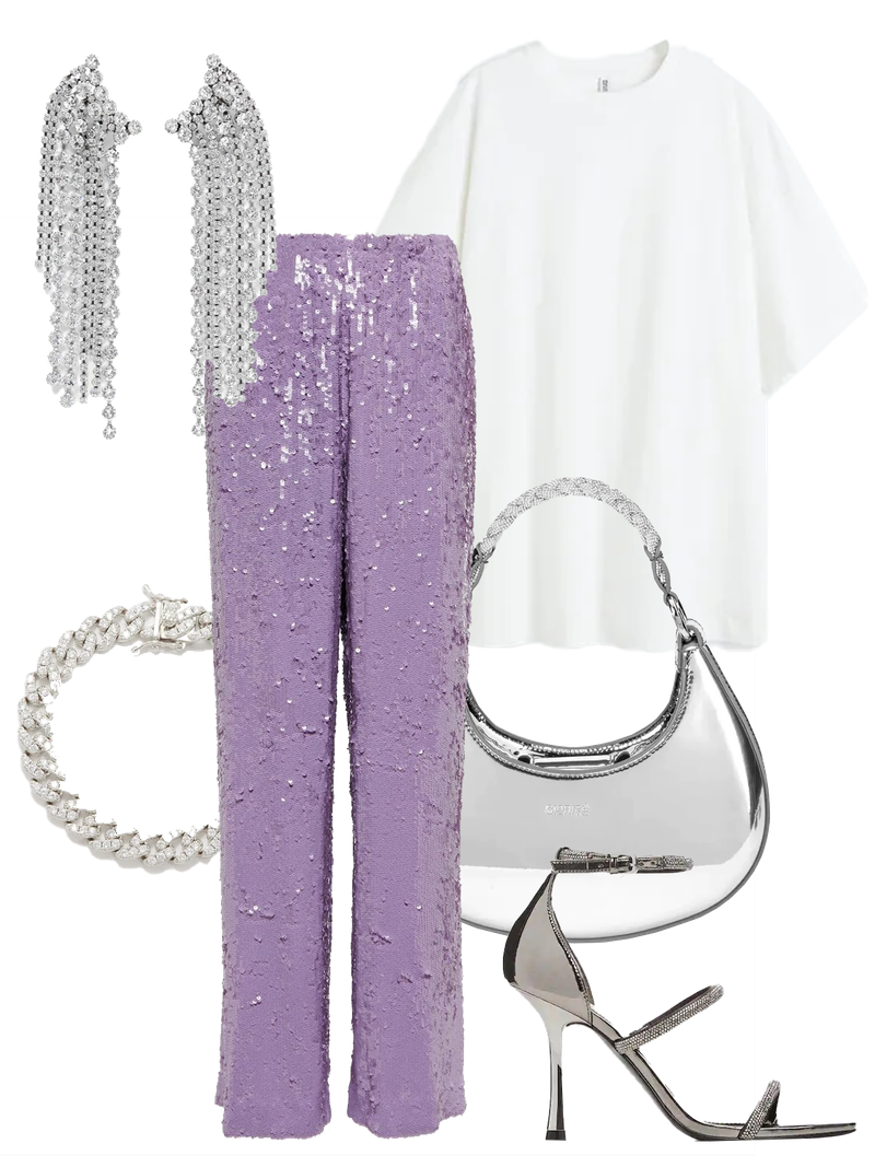As someone who prefers to ring in the new year at home with close friends, I like to dress up but in an easy kind of way. This year, I’m going for a lilac sequin slouchy pant with a basic t-shirt and an excess of crystal accessories.