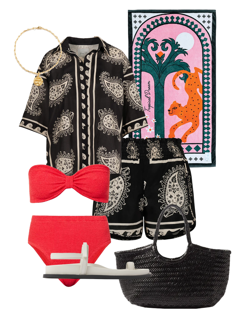 The weather at this time of year means no place is more happening than the beach. For an afternoon by the water, I like to wear easy separates over my swimwear that dry easily. This cotton voile co-ord from Johanna Ortiz is so cool – I love the print and it works really well over a colour-pop bikini.