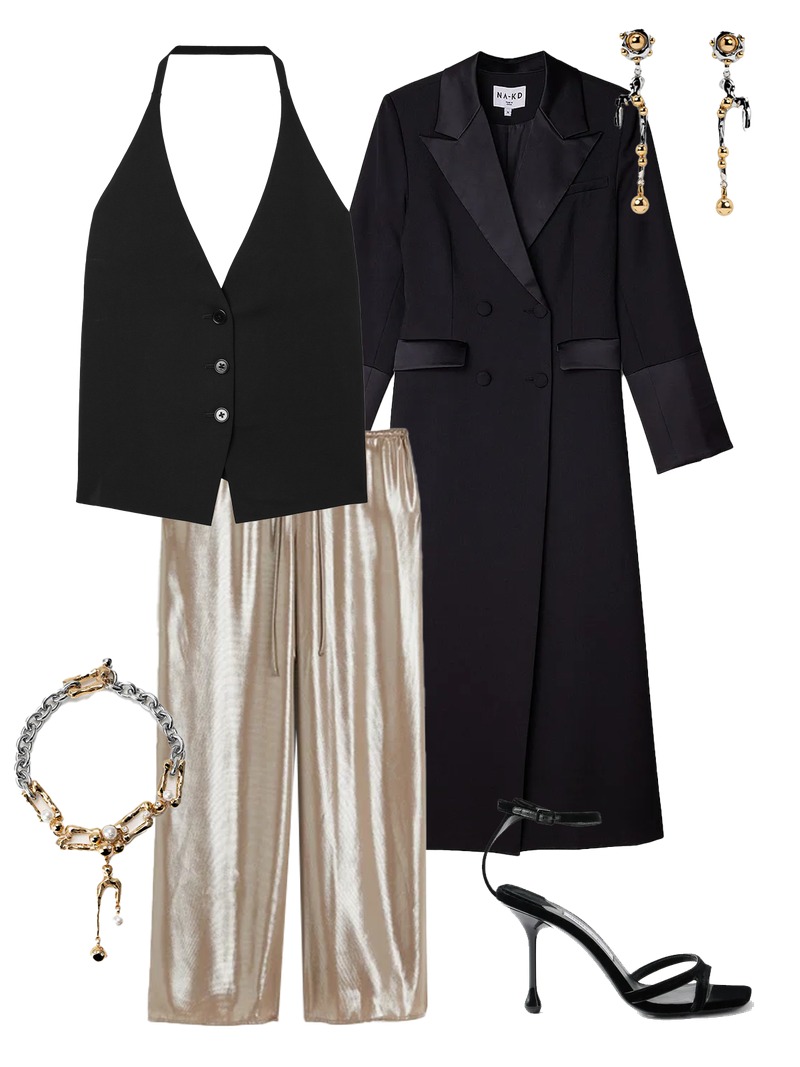 For me, festive dinners mean getting dressed up but comfortable. I love statement trousers – I’m going to wear these slouchy ones from H&M with a minimal halter top, layered with a long-line tuxedo maxi blazer and statement accessories.