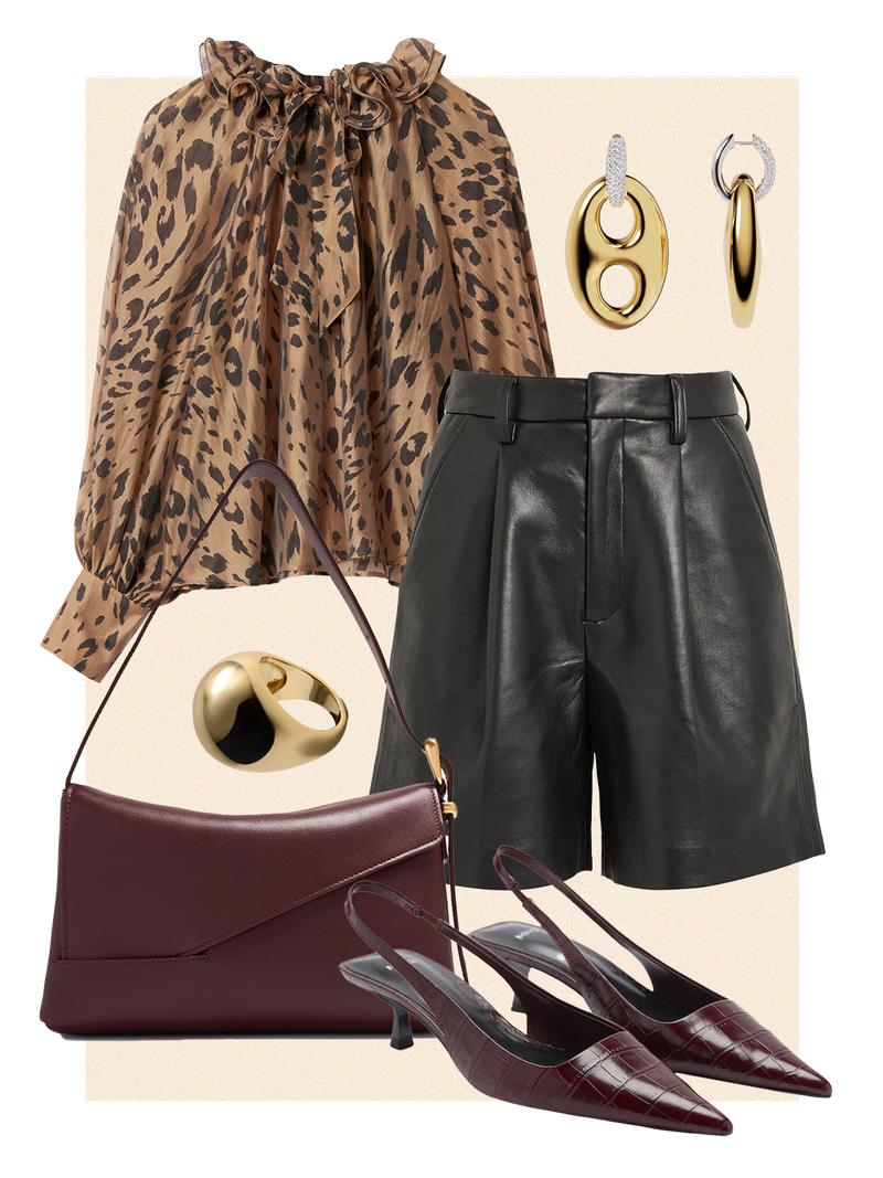 Take your leopard blouse from day to night by styling it with leather shorts and on-trend burgundy accessories.