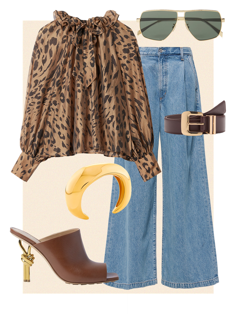 Take styling cues from the Chloé runway and team the blouse with wide-leg jeans and mules for a chic daytime look. Oversized sunglasses add a vintage touch.