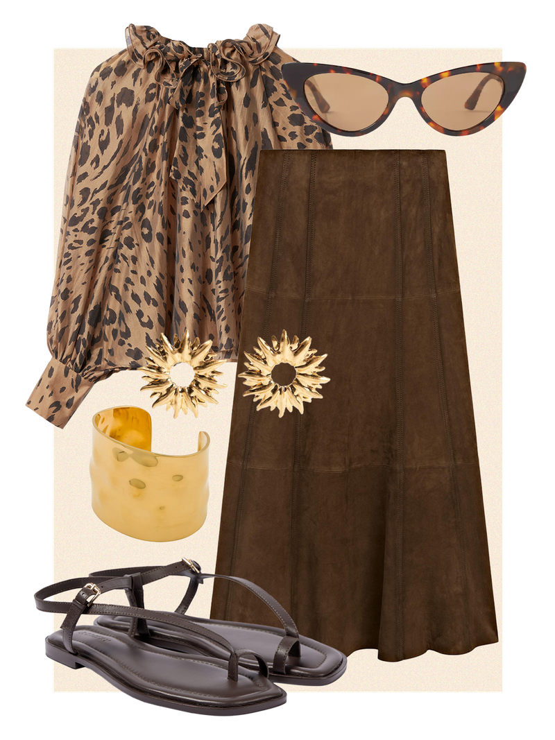 From bags to jackets and skirts, suede is a key texture for AW24. Style this blouse with a brown skirt and sandals now, and boots later on. Add a gold cuff over the sleeve for extra polish.