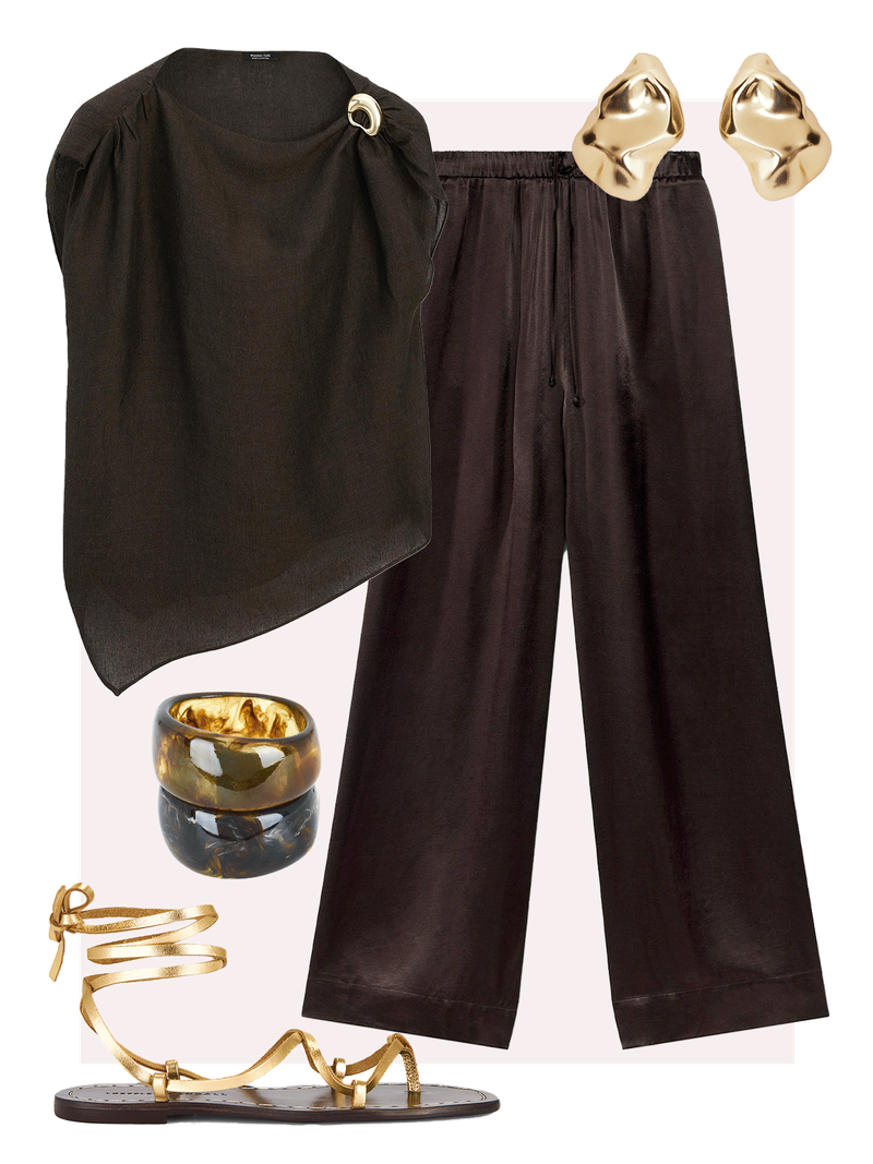 For a refined take on warm-weather dressing, we’ve paired the blouse with wide-leg satin trousers and chunky tonal resin bangles. Sculptural accessories add a touch of drama to the look.