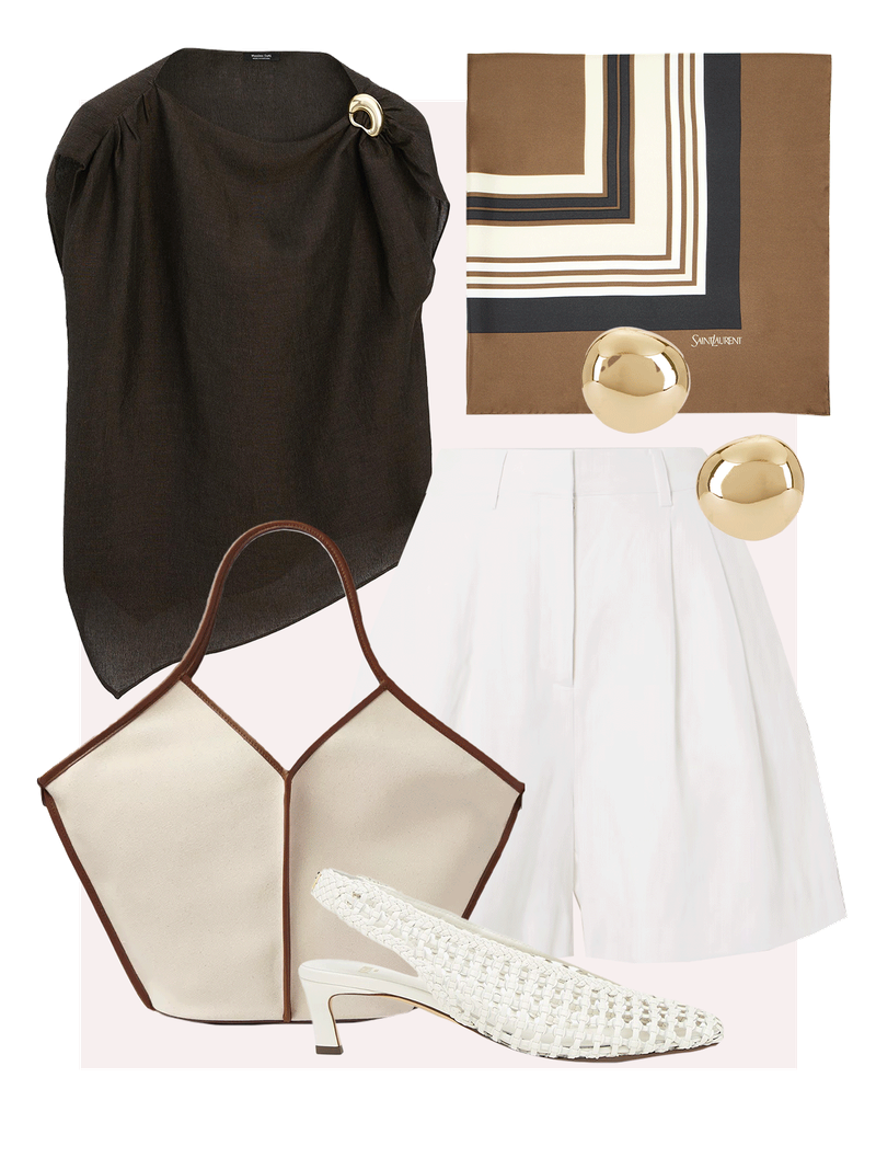 For a light and breezy outfit, style the blouse with white linen shorts – simple, relaxed and endlessly wearable. Tie a silk scarf at the neck or in your hair for an elegant finish that works from brunch to beach walks.