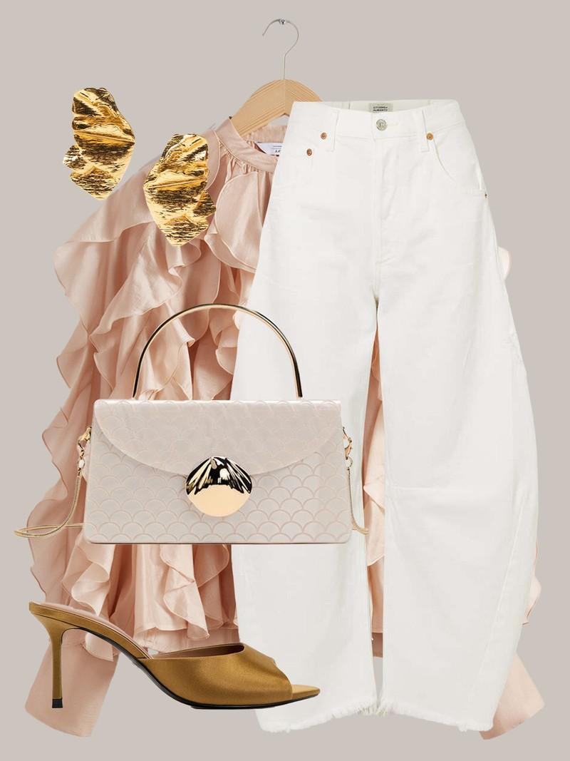 Paring this blouse with white jeans is a no-brainer for easy summer style. Metallic accessories immediately take the look from day to night, too.