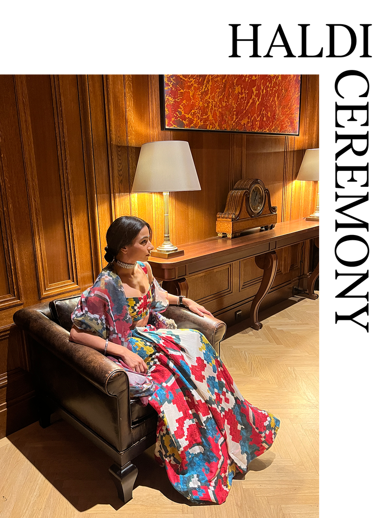 The haldi ceremony is all about colour, so I opted for a bright, printed lehenga set from a Mumbai-based label, Saaksha & Kinni. It makes cool separates that combine traditional styles with a modern touch. This outfit was one I’d purchased a while back and had worn only once before, so it was the perfect time to rewear it. Because it was a daytime event, I didn’t want to overwhelm myself with elaborate jewellery, so I opted for a silver choker from Amrapali instead.