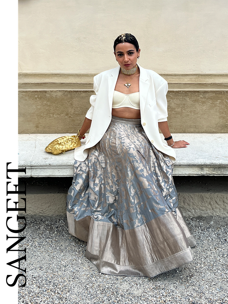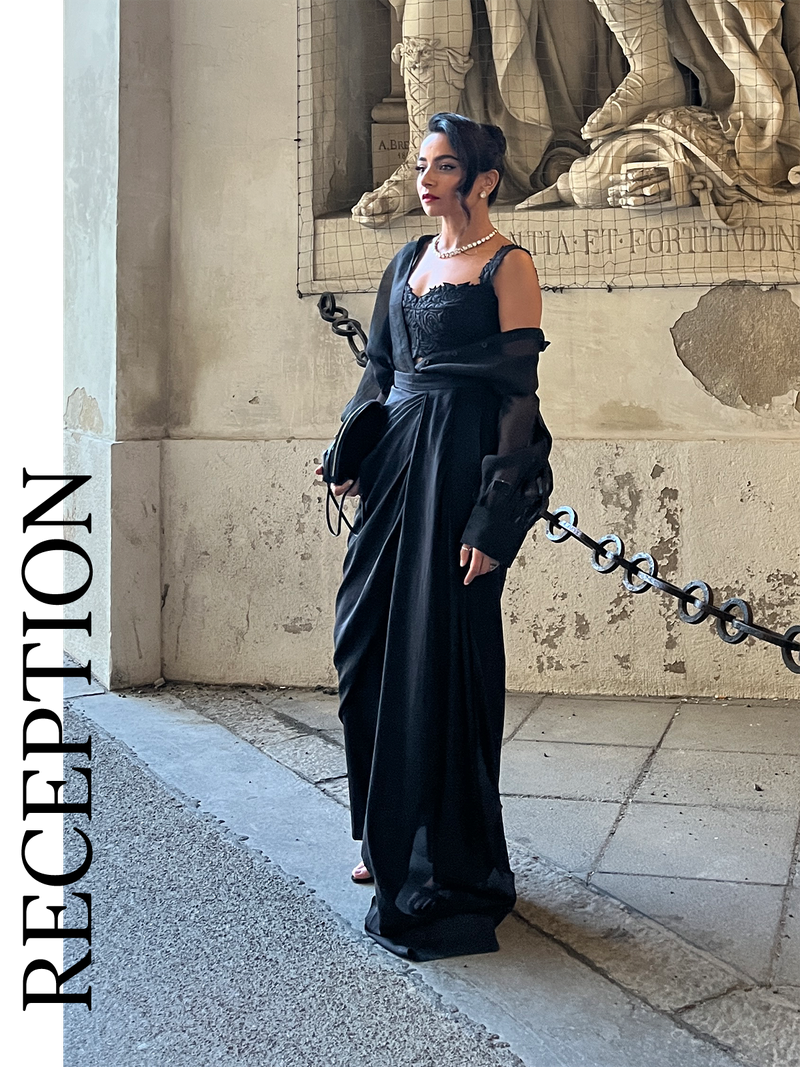 The final event was a Viennese Ball held at the Spanish Riding School. It was a stunning historical monument that was converted into a grand ballroom, and the theme was black-tie and evening gowns. A gown isn’t something that I’d typically wear, so I looked at the contemporary Indian designers I love. I have a black draped skirt set from Aikeyah that comes with a bralette and organza overshirt – but I had my heart set on wearing trousers. I mixed and matched the upper body components with some trousers from REIK Studio, a brand that really resonates with my personal style. The trousers have an attached drape that sweeps the floor – making it a little more dramatic. I wore the overshirt off my shoulders and pulled up the sleeves for added volume. For jewellery, I wore a statement set of polki (uncut diamond) style bangles from various brands including Anayah Jewellery and borrowed a necklace and studs from my mum. I carried my Alaïa heart shaped bag.