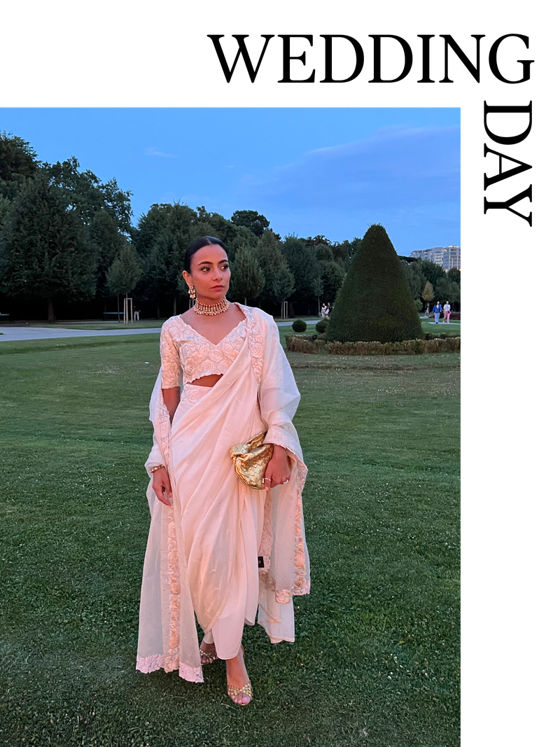 For the main wedding day, which took place at the Belvedere Palace, I wore a set from Aikeyah – a brand that I often turn to for traditional outfits. The brand ticks every box; the pieces are simple yet detailed in their layering and the monotone embroidery makes them easy to style with both gold and silver accessories. I opted for a pre-draped sari that came with an additional dupatta drape. I purchased the set in ivory with an organza drape and added gold sequins. Organza is a fabric that adds volume, so where the outfit was supposed to be worn across one shoulder along the body, I chose to wear it off my shoulders like a stole – I think it looked a little more regal. My jewellery was a mother of pearl set from Preeti Mohan jewels, that I had picked up in Delhi, and I wore my Bottega bag with my favourite gold Aquazzura heels.