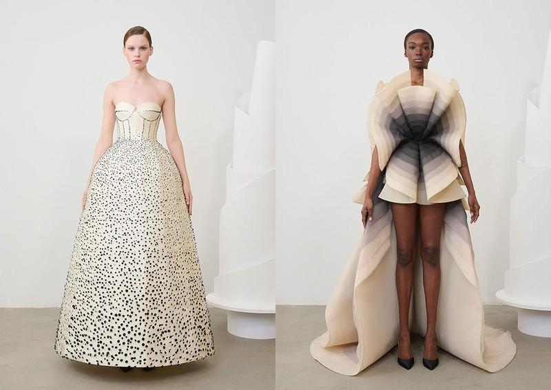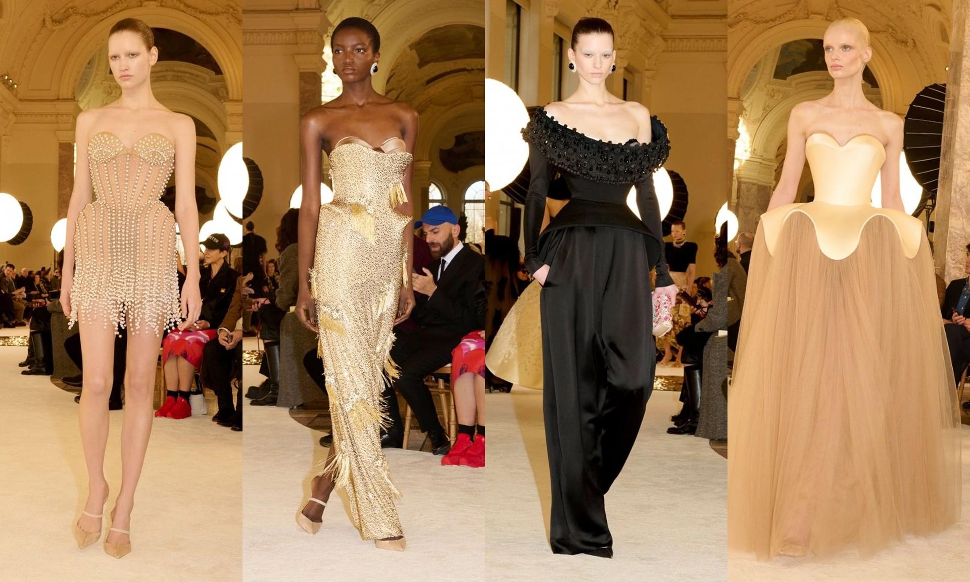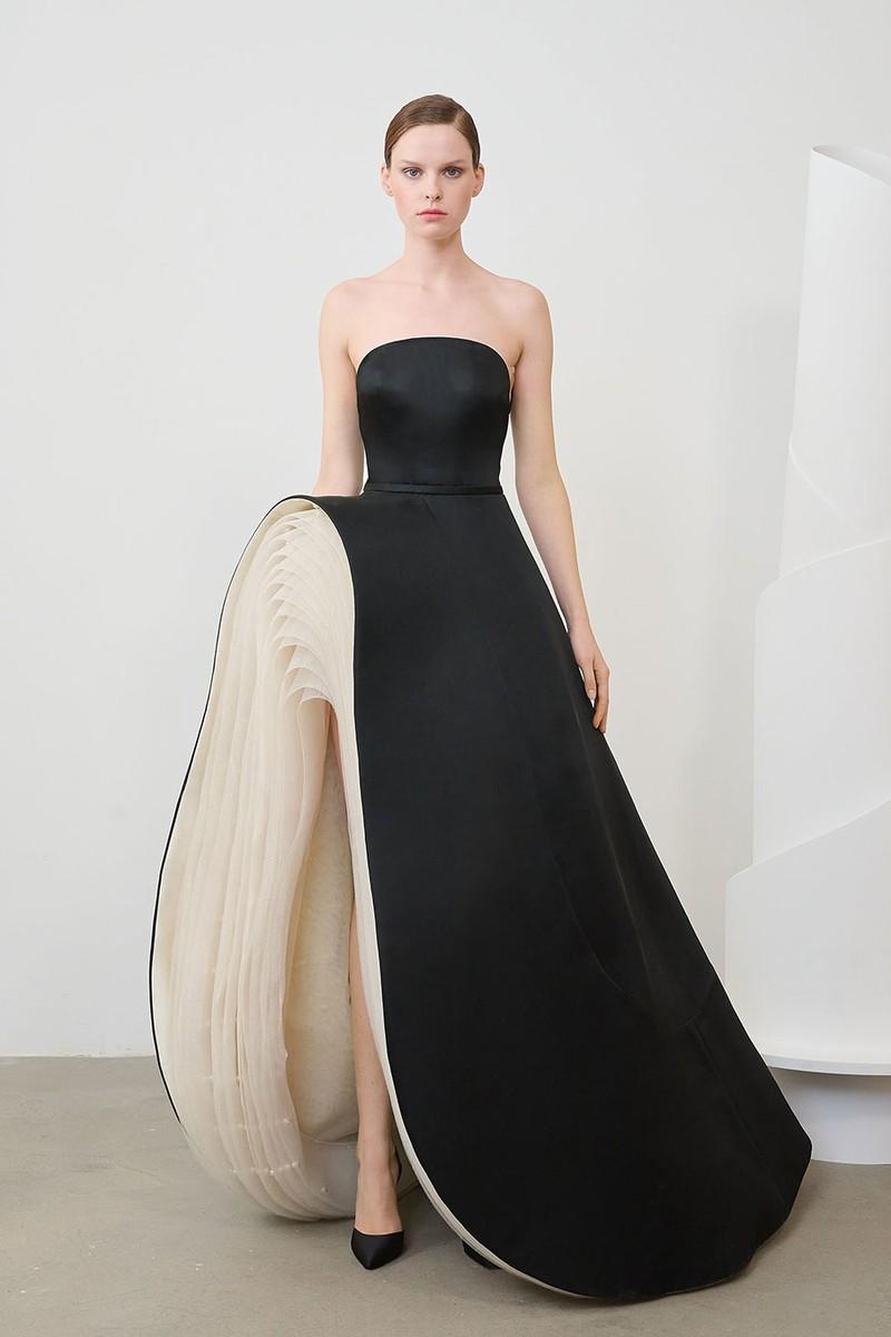 After creative director Daniel Roseberry discovered some 1920s and 30s antique ribbons in a Parisian shop, his latest couture collection started to take shape. The ‘Icarus’ collection took further inspiration from Greek mythology with structured jackets, duchess satin bustier gowns, and neoprene opera coats. Dominated by black, ivory, and champagne colours, the aesthetic was sophisticated and dramatic.