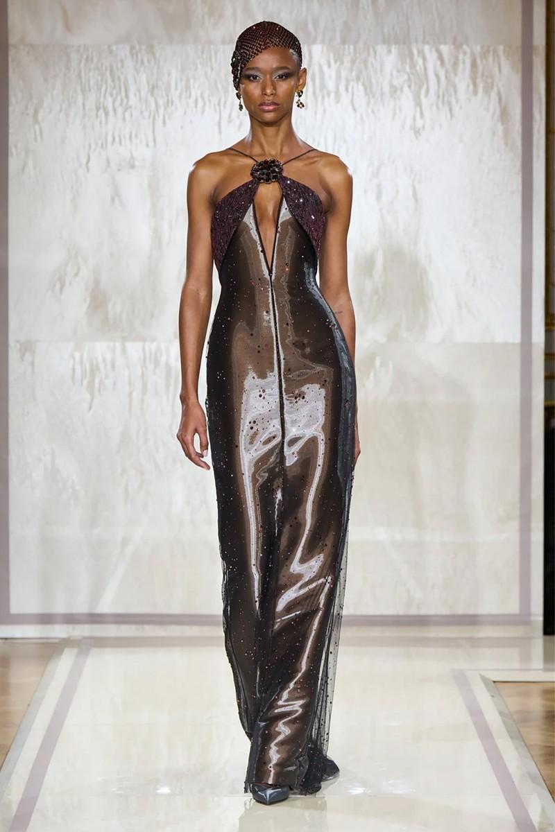Giorgio Armani marked 20 years of Armani Privé with a collection that honoured the house’s global influences. Reflecting Armani’s timeless aesthetic, standouts included shimmering black gowns, Asian-inspired fitted jackets and crystal-encrusted full skirts. Intricate pearl embellishments also featured heavily throughout. The man himself, now 91, received a standing ovation when he walked out onto the runway at the end of the show.