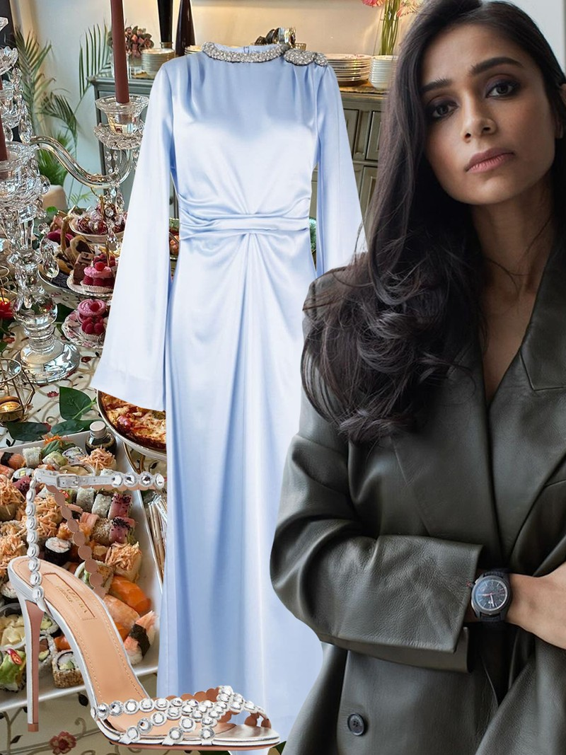 “Dressing up for Eid is one of the most important parts of the day and although I have a few options, I’m hoping to wear this beautiful Rachel Gilbert dress I got from the Farfetch modest edit – it’s such a stunning shade of blue. I also have a hot pink Misha Lakhani kaftan I’d love to wear. It’s a brighter shade than what I’d normally go for but it falls really well and I’m looking forward to pairing either look with the Aquazurra Tequila sandal in silver.
