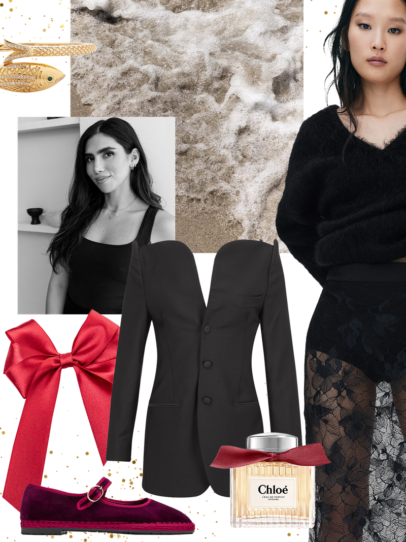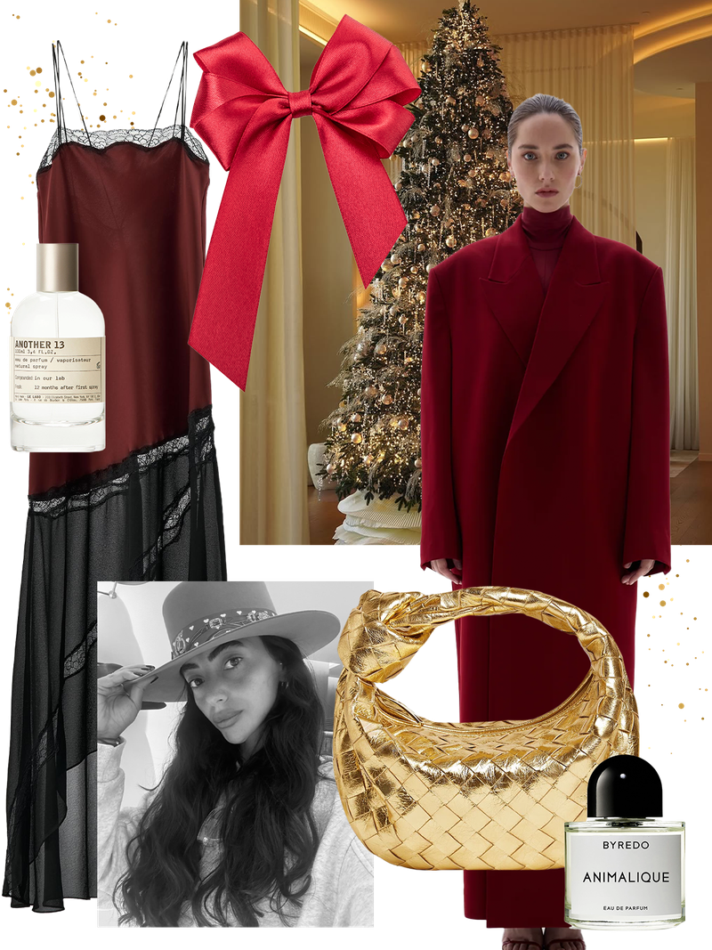 “I personally love wearing a special dress at Christmas – even if I’m just heading to the dining room, I enjoy putting on something nice and getting into the festive spirit. This year, the Zara Silk Lace Burgundy Slip Dress is calling my name – it’s simple but so chic. I’ve been drawn to burgundy lately, and the Bouguessa Nouf Long Blazer Coat would be such a dreamy addition to my wardrobe. The padded shoulders are everything.