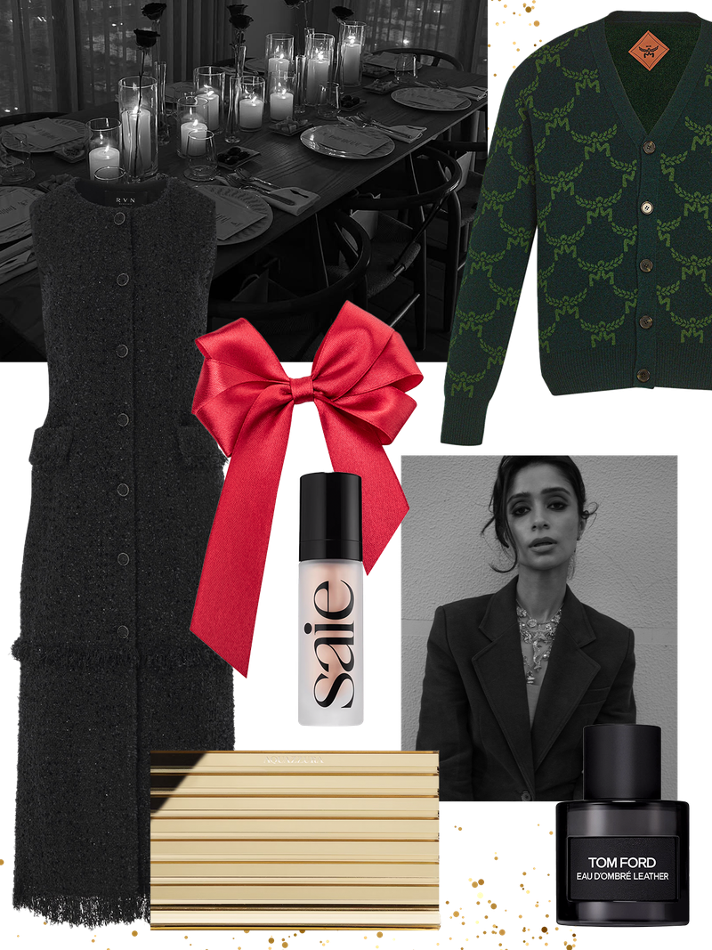 “My go-to beauty look is always a dark eye and Tom Ford’s Honeymoon Palette has all the shades needed. I rely on Ilia’s Super Serum Tinted Foundation – it keeps my skin moisturised and flawless. Saie’s Glowy Super Gel Illuminator in Rose Glow is one of the best highlighters I’ve come across recently. I especially love it in cooler weather because it adds the perfect shine while moisturising my skin. Rouge Dior 999 in Velvet Finish is my go-to for lipstick – it’s the perfect red for festive occasions. My fragrance for the season is Tom Ford’s Eau d’Ombré Leather.”