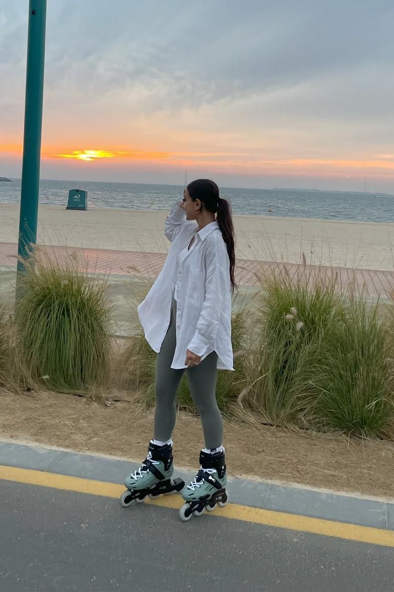 My weekly workout routine prioritises variety and recovery. I do strength training three days a week: day one is lower body, so squats, lunges and deadlifts. Day two is upper body, so push-ups, rows and push-presses. Day three is core and stability work, so usually Pilates. I follow up with two days of cardio; I like indoor cycling and lower-intensity cardio, like walking or padel. On recovery days, I always foam roll or self-massage, prioritising quality sleep and proper hydration. I’ve recently started incorporating ice baths into my recovery routine, too. This has helped a lot with breathing and mindset.
